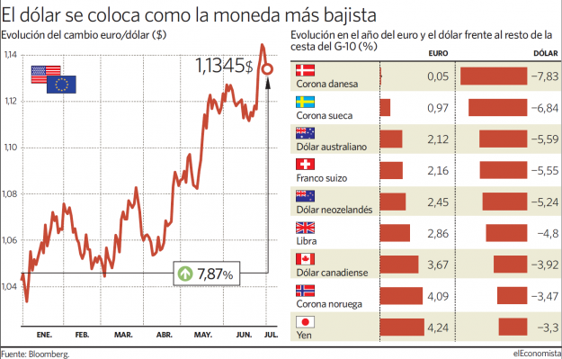 El euro ha batido la resistencia que encontraba en los 1,14 dólares y va camino de hacer lo mismo con los 1,145, aunque ahora está consolidando, desde el punto de vista técnico. Desde el 1 de enero se revaloriza en este cruce casi un 7,9%, lo que significa su mejor año desde 2007. Sin embargo,…